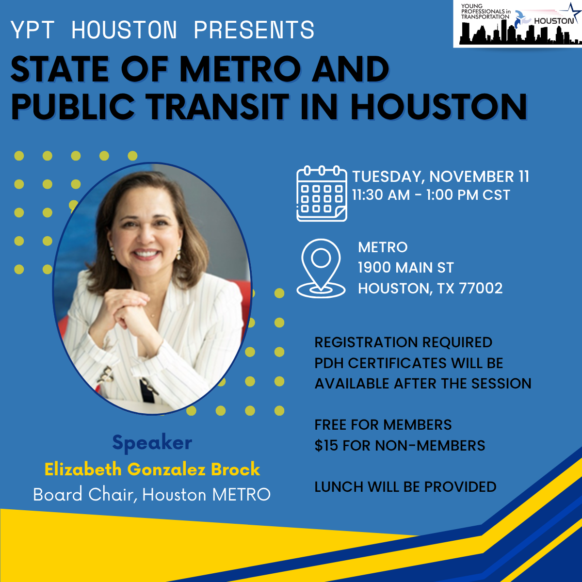 Join YPT Houston on Tuesday, November 11 at 11:30 AM for a technical luncheon with Elizabeth Gonzalez Brock, the Board Chair of Houston METRO, to learn about the State of METRO and Public Transit in Houston!