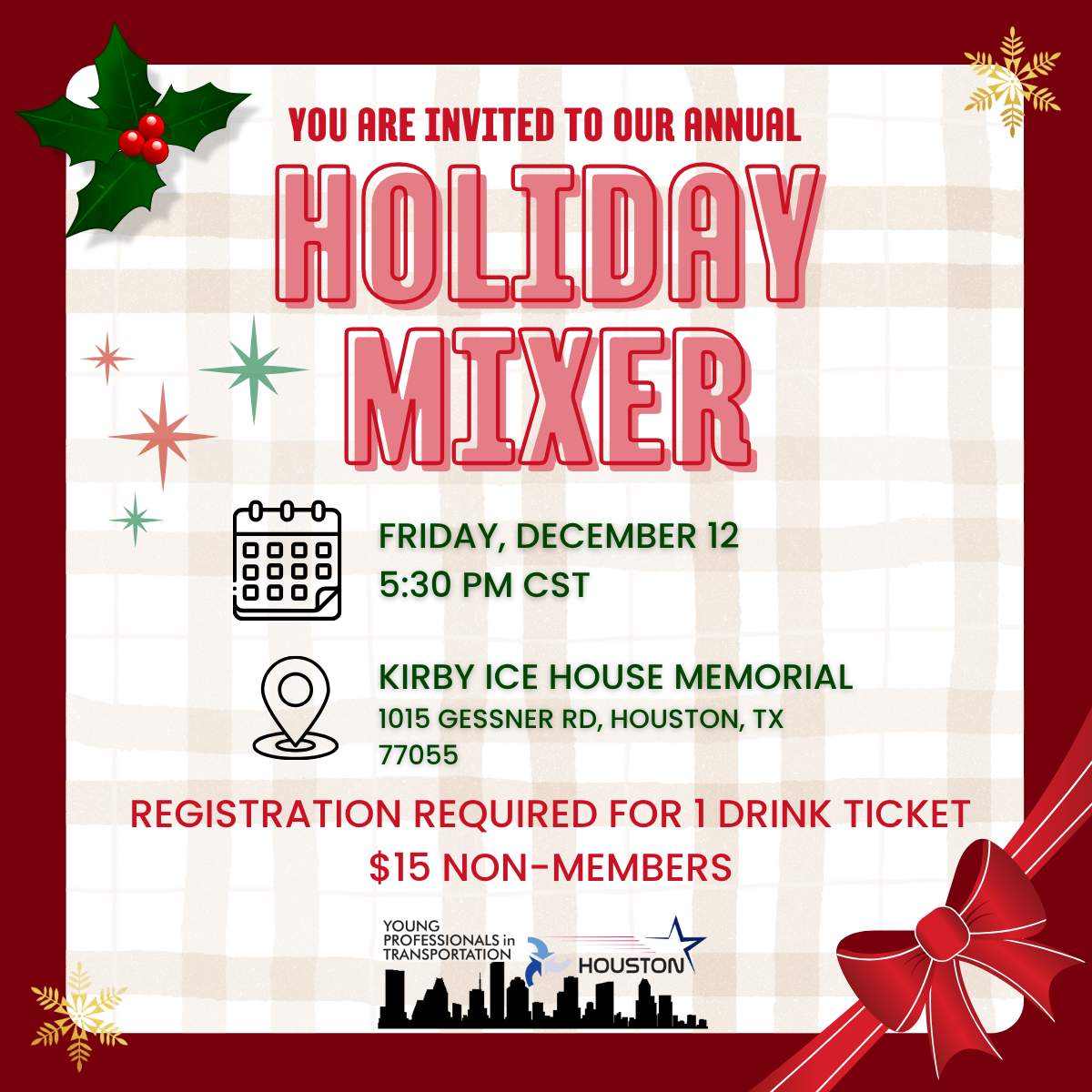 Come celebrate the Holiday Season with YPT Houston on Friday, December 12th at 5:30 PM at Kirby Ice House! One free drink ticket will be provided.